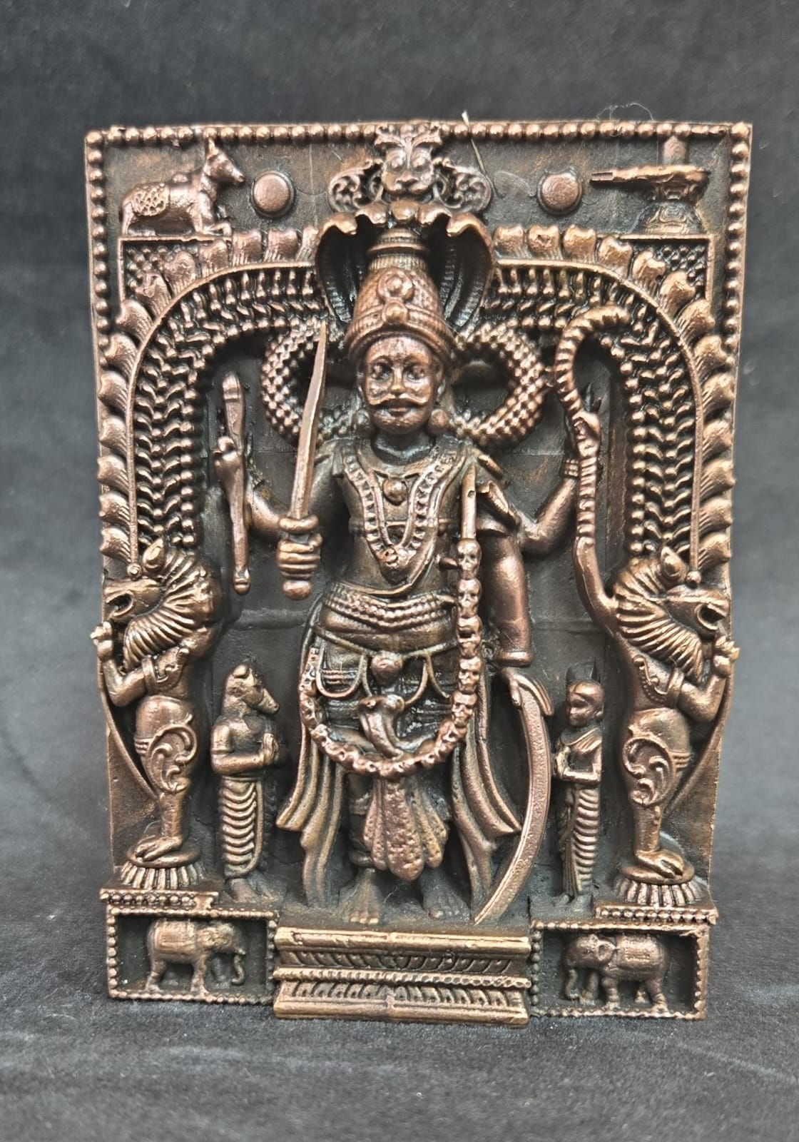 Ornate copper relief plaque depicting a multi-armed deity, 4 inches. Richly detailed temple-style artwork.